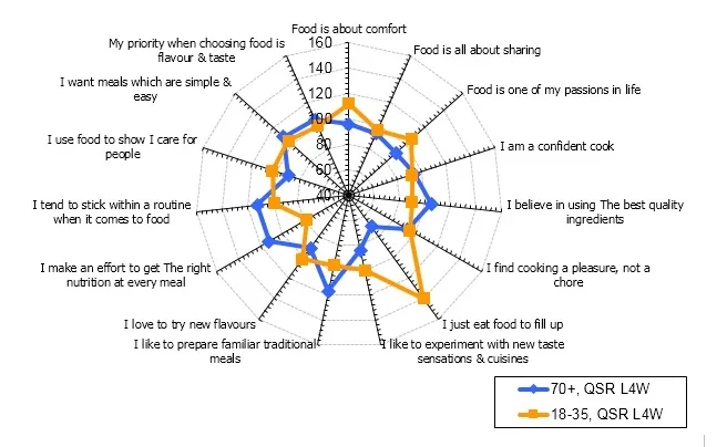 Looking at the Radar we can compare their attitudes to 18-35s and see what they index highly on - what ticks their boxes? Understandably for the older age groups nutrition and traditional foods rate well as do quality ingredients. Quantity and new tastes don’t come through strongly.