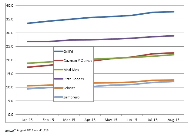 Grill’d have featured previously for customer service wins, quality food and healthy options and this will play a part as more of their customers become promoters of the brand and awareness continues to grow. Plenty of brands in this range of awareness were flat or only slightly increasing for the same period and it is interesting to note that three of them promote Mexican food; How long before we see the KFC Burrito appear on Australian menus?