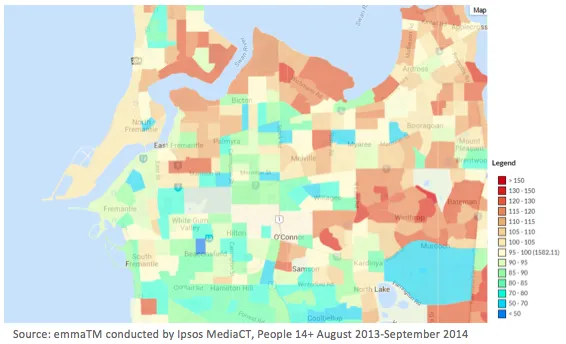 The map here shows the Freemantle area of Perth, overlayed with data based on the Household Expenditure Survey (HES) looking at household spend on ‘fastfood and takeaways’. The average per annum spend is $1,582.11 which is at 100 on the index. Any location with a population spending more than the median is in orange to red depending on how much they over index. Areas turning increasing blue, show a lower than average spend level from their populations.