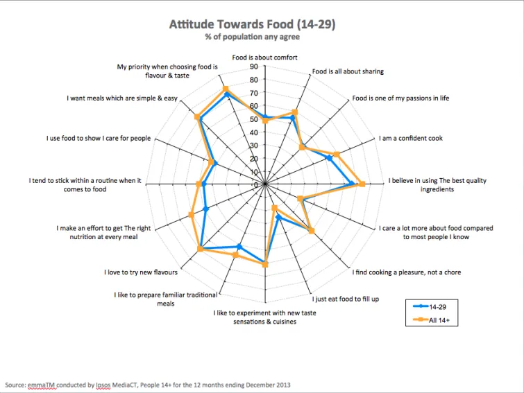 When it comes to the 14-29s, there are some clear distinctions compared to the wider Australian population. Getting the right nutrition and preparing traditional meals is less of a priority for the youngsters - food is seen as a necessity to fill up. Youngsters are also less fussy about eating the highest quality ingredients and not as confident cooks compared to the average Australian. Not surprisingly, the 14 -29 year olds are far more likely to choose the convenience of a Quick Service restaurant compared to any other age group.