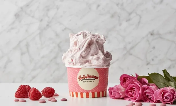 The gelato consists of raspberries, rosewater, meringues and Callebaut’s Ruby Chocolate.