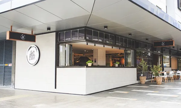 Their latest outlet features a façade comprised of raw steel and large glazed elements which allows customers to see into the venue’s open kitchen, complete with a large pizza oven and bar space. Its in-store design was made in collaboration with Decon.