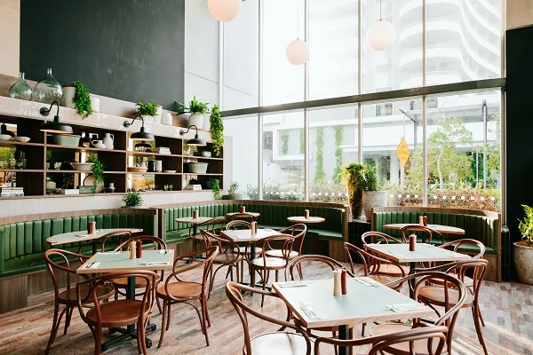 The 130-plus seater restaurant features an al fresco dining area with greenery and natural finishes. Warm tones, industrial lighting and leather banquettes were placed to provide an all-day ambience.