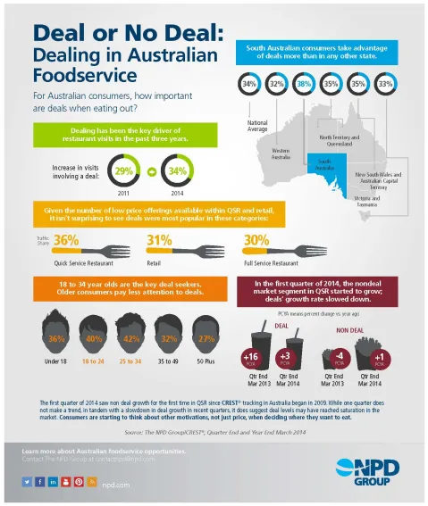 According to a survey by the NPD Group, dealing has been the key driver of restaurant visits in the past three years. From an increase of 29% in 2011, restaurants have seen a 34% increase this year in visits involving a deal.
