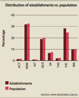 While less populated states such as the Australian Capital Territory and Northern Territory have the smallest number of establishments present in the market.