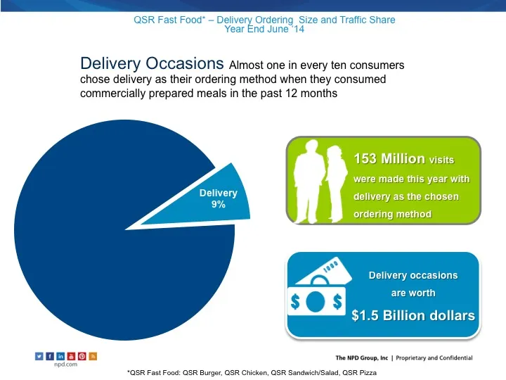 The report notes that home delivery in the QSR industry is now worth $1.5 billion, with one in every ten QSR consumers choosing delivery as their ordering method.