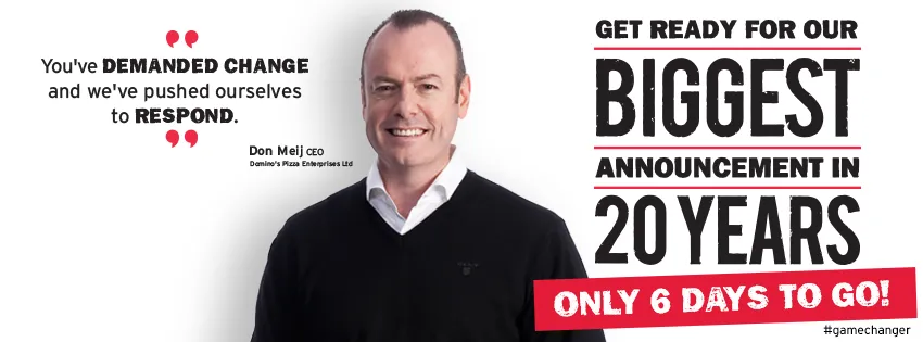 Don Meij, CEO of Domino’s Pizza Enterprises Ltd., states, “Australia, you’ve demanded change and Domino’s has responded. It’s the biggest announcement in our 20-year history, a real game changer. Everything will be revealed on the 11th of March.”