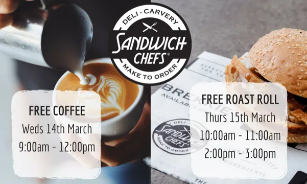 On the 14th of March, Sandwich Chefs is offering free coffee on March 14 from 10am to 12pm and free roast rolls on March 15 from 10am-11am and 2pm-3pm.