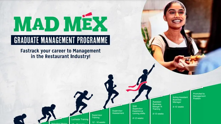 “Our Graduate Program is designed to fast track the future leaders of Mad Mex. As part of our Graduate program, you will commence your career in a full time position of Luchador, Senior Luchador, Supervisor and then graduate as an Assistant Manager or Restaurant Manager within Mad Mex where you will be placed in one of our restaurants to manage,” the chain said in its listings for the program.