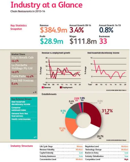 Over the five years through 2013-14, revenue for the Chain Restaurants industry is forecasted to grow at an annualised 3.4% to reach $384.9 million.