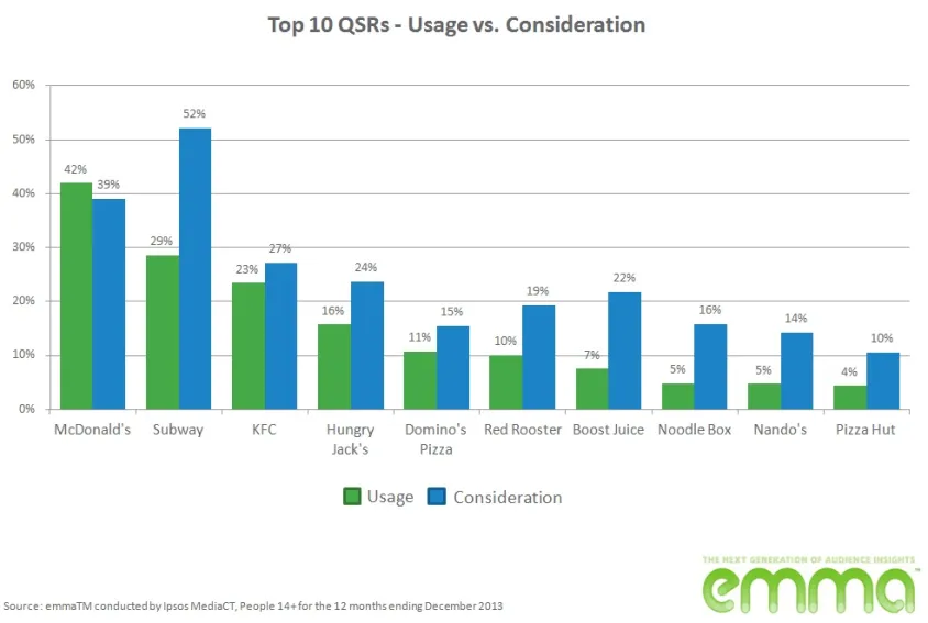 Perhaps unsurprisingly, McDonald’s comes out on top, with roughly equal consideration vs conversion rates i.e. the number of people considering purchasing a meal at the burger chain equates to the number who eventually go on to do so. The brand also has relatively strong consumption rates, with nearly 42% of Australians (14+) eating there.