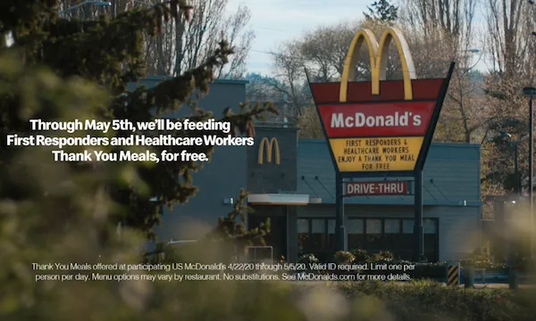 McDonald’s is offering free “Thank You Meals” to healthcare workers, police officers, firefighters and paramedics in the US. Available through 5 May, eligible customers can either choose from a range of breakfast, lunch and dinner options that come with a soft drink, tea or hot coffee. Read more here.