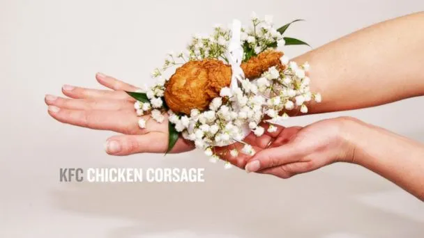 A video ad campaign was posted on KFC's website featuring a young man offering his date a fried chicken corsage. It starts off as awkward but ends with the girl taking a bite of her corsage.