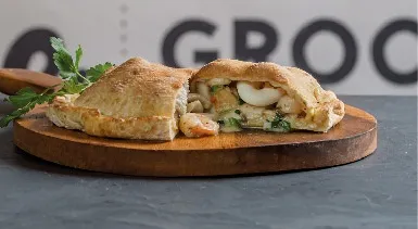 The Hottie is a calzone stuffed with chorizo, Spanish onion, Kalamata olives, roasted red peppers, and chilli.