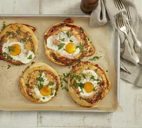 - A Breakfast Scroll layered with fresh herbs, tomato passata sauce, mozzarella cheese, bacon and finished with an egg baked on top (also available as a vegetarian option).