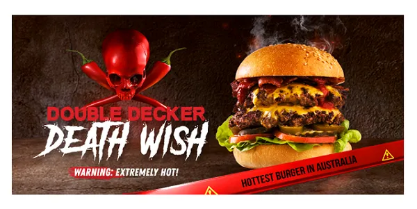 Aptly named the Double Decker Death Wish, the new offering contains two angus beef patties, maple bacon, cheese, pickles, jalapeños, tomato and lettuce with ghost pepper chilli sauce.