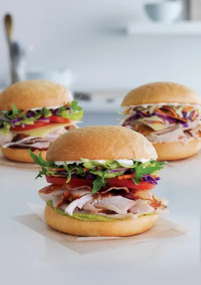 The BLT Smash Burger is made with warm pulled roast chicken, crispy bacon, avocado, tomato, salad, rocket and mayo on a lightly toasted sourdough bun or tortilla wrap. The fresh Chilli Slaw Burger has warm pulled roast chicken, slaw, mayo, red onion, tasty cheese, chilli aioli on a lightly toasted sourdough bun or tortilla wrap. The True Blue Burger includes warm pulled roast chicken, salad, rocket, red onion, tasty cheese, mayo and beetroot relish on a lightly toasted sourdough bun or tortilla wrap.