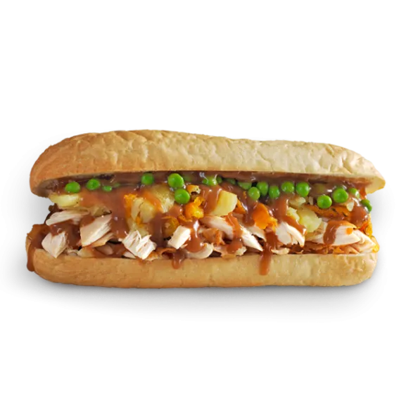 The Roast to Go meal includes: pulled Roast Chicken, crispy tasty skin, chopped roast Potato and Pumpkin and Gravy and peas on a crunchy bread roll.