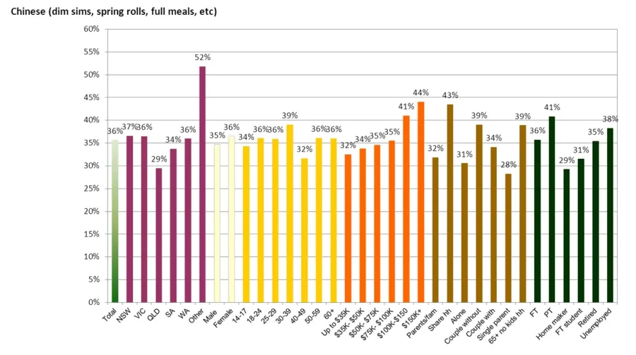 The minority of fast food/snack consumers consumed Chinese Food in the last two months (36%).