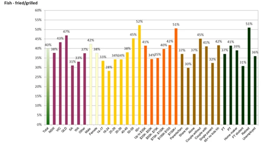 According to BIS Shrapnel, across the total population of Fast Food/Snack consumers, 40% consumed Fish – fried/grilled. Significant differences are noted in age and work status. Those aged 50-60+ are significantly more likely to consume Fish – fried/grilled than those aged between 18-24 and 30-49. This translates to work status as retirees are significantly more likely to consume Fish – fried/grilled than people who are full time students or who work full time.