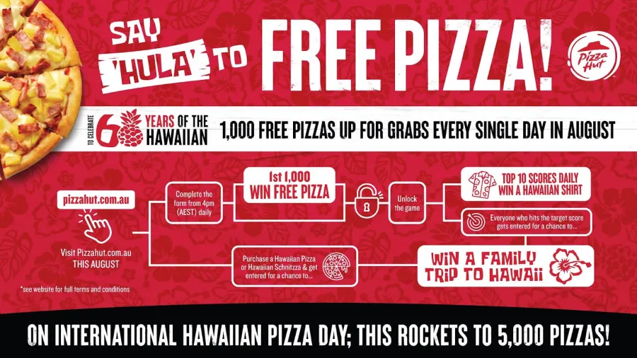 Pizza Hut Australia will give away 35,000 free pizzas, limited edition Hawaiian shirts and one family trip to Hawaii as it celebrates the 60th anniversary of the Hawaiian Pizza.