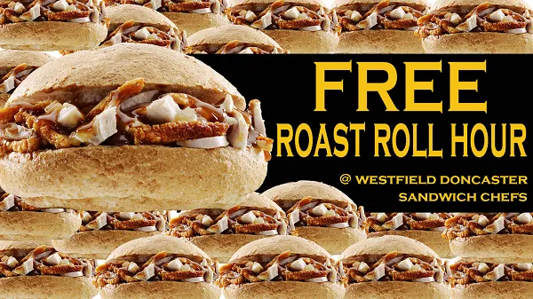 Sandwich Chefs Westfield Doncaster is giving away free roast rolls between the hour of 12pm and 1pm on Wednesday May 3. Guests can choose from Pork or Beef, placed in a freshly baked roll and drizzled with homemade gravy.