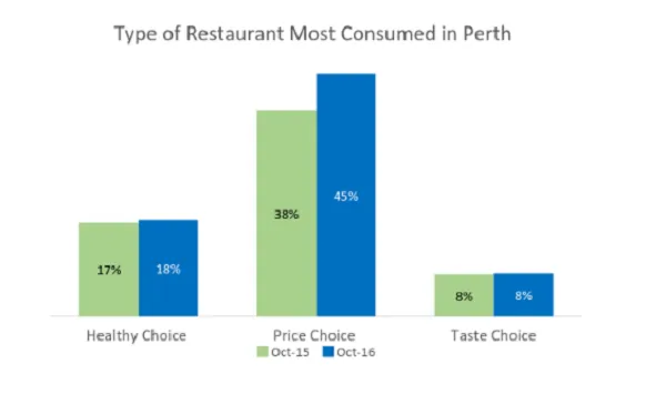 So what has contributed to this growth in the Perth market? Choosing a QSR that is health and taste-focused have remained stable, however we have seen a rise in the price choice restaurants, from 38% to 45% YOY (an 18% increase). Even though they are searching for value, consumers are prepared to spend more on QSRs in a week. This aligns with the fact that the average personal income of a Perth resident has grown 3% YOY, the national average remaining steady. This motivation to choose based on price is not due to lack of income but consumers desire to spend more wisely.