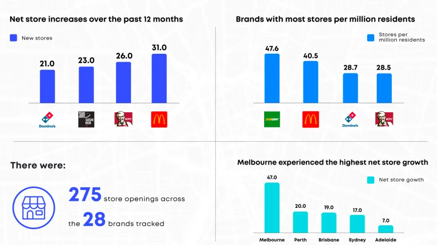 For this period, McDonald's (31), KFC (26), Sushi Hub (23), and Domino's (21) had the most openings whilst Subway, Pizza Hut, and Nando’s recorded the most decline.