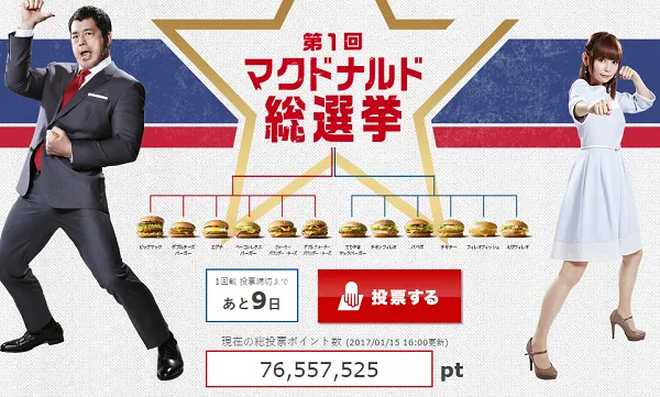 - McDonald's Japan is holding an election to find out which of its twelve most popular burgers is the 'number one'. According to the report by Mashable, the burgers, which are split into two teams, each have their own election videos and even campaign promises. READ MORE HERE