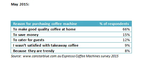 Overall, 66% said they bought their machine to enjoy great tasting coffee at home, while 15% did so in order to save money and 12% were looking for the best way to cater for guests.