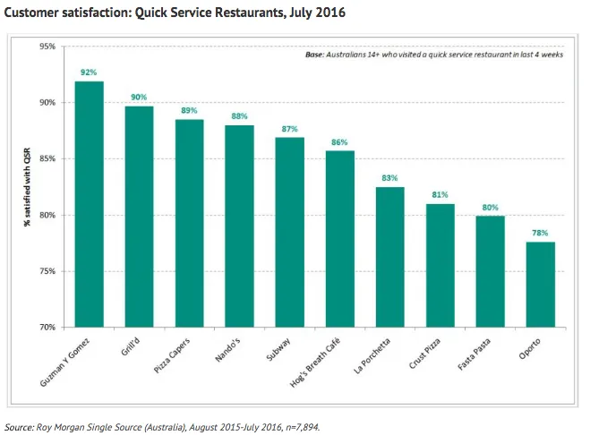Brands Grill'd, Pizza Capers, and Nando's followed Guzman y Gomez' lead, with 90%, 89%, and 88% satisfaction ratings respectively.