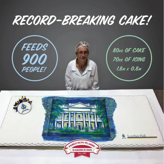 Ferguson Plarre Bakehouses made a record-breaking cake using 70 Kilos of Icing and 80 Kilos of Chocolate Mud Cake. The cake itself weighed in at 190 kilos, and was given to 900 guests at Lowther Hall.