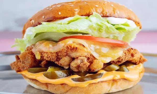 Huxtaburger unveils its new Rachel Burger featuring a choice of grilled or fried chicken, with cheese, aioli, lettuce, tomato, jalapeños, and sriracha mayo.