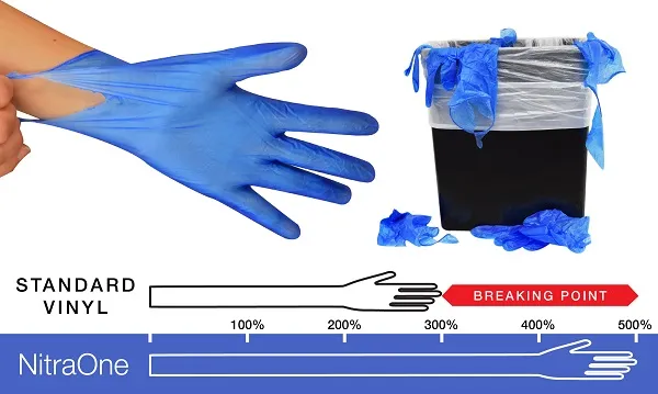 The standard vinyl glove has a minimum of 300% ultimate elongation / elongation at break, whilst NitraOne has a minimum of 500%.